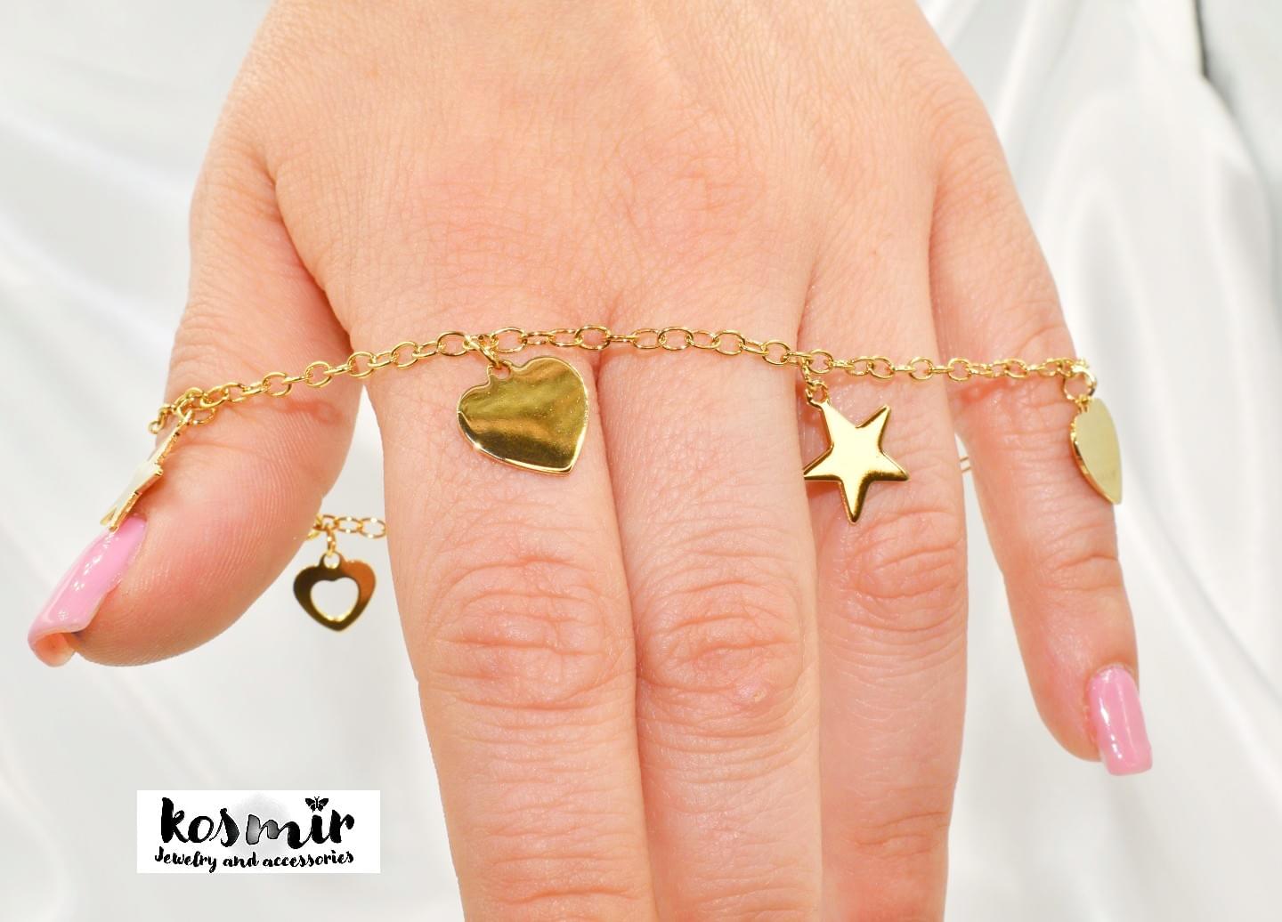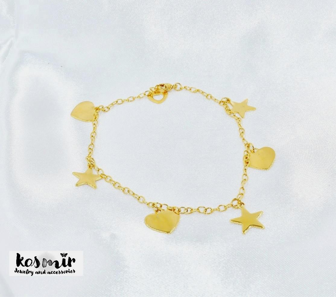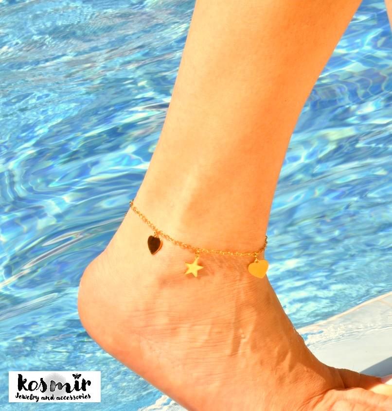 Ατσάλινο χρυσό βραχιόλι ποδιού με κρεμαστές καρδιές και αστεράκια