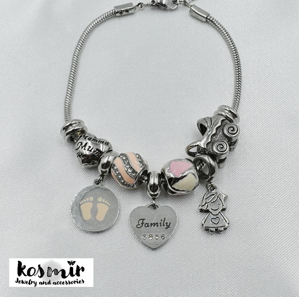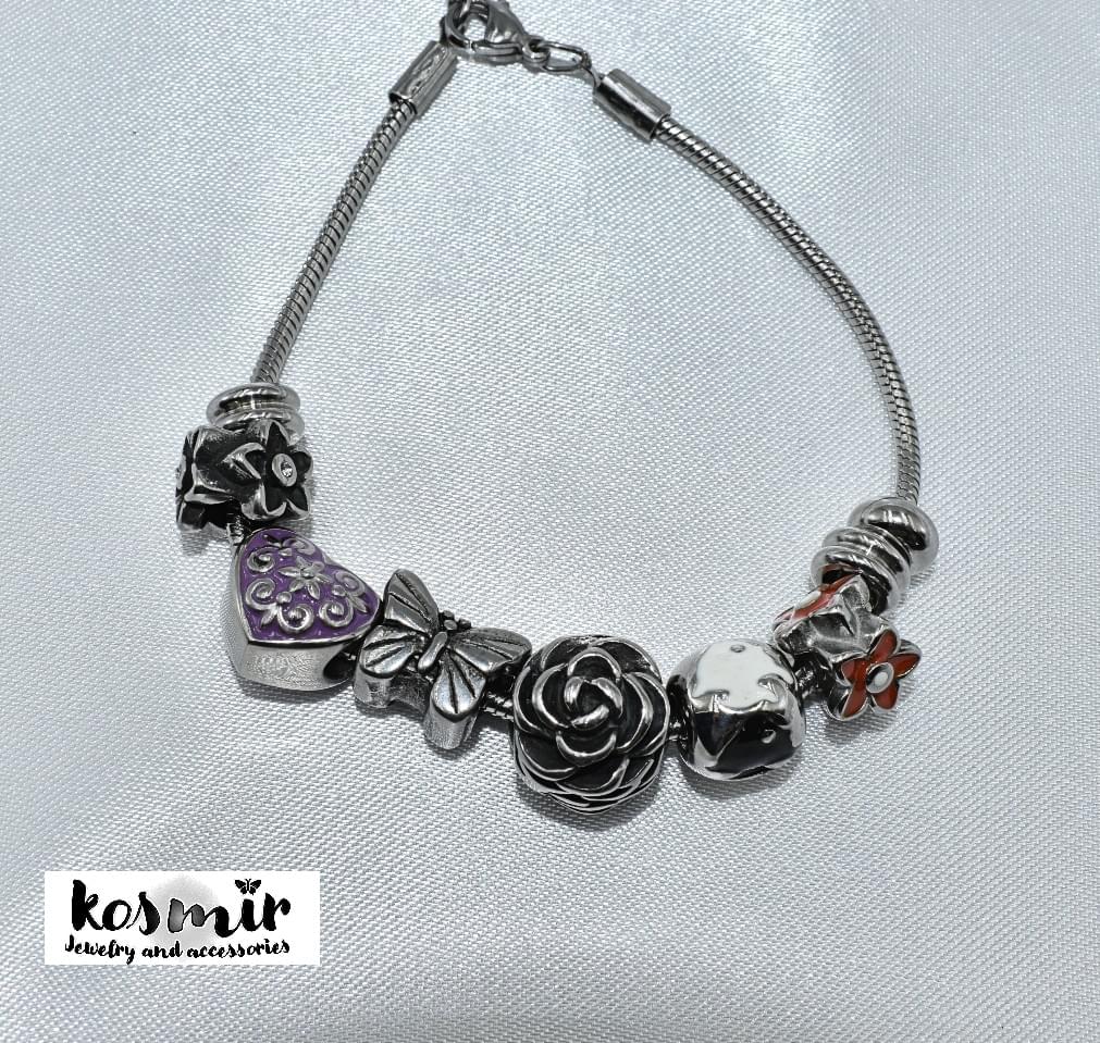 Τόσο το βραχιόλι, όσο και όλα τα beads και charms είναι από ατσάλι, που σημαίνει ότι είναι ανθεκτικά στο νερό, τη θάλασσα και τα χημικά.