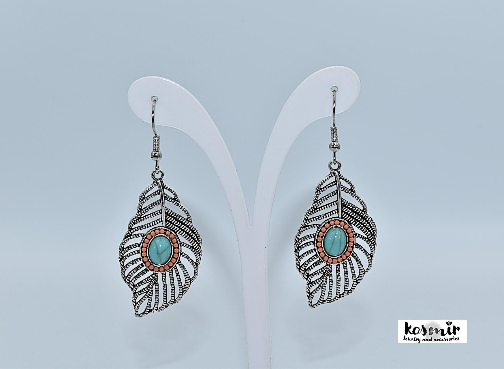 Επάργυρο μακρύ φύλλο με τιρκουάζ πέτρα και πορτοκαλι λεπτομέρειες.Μήκος 8 cm