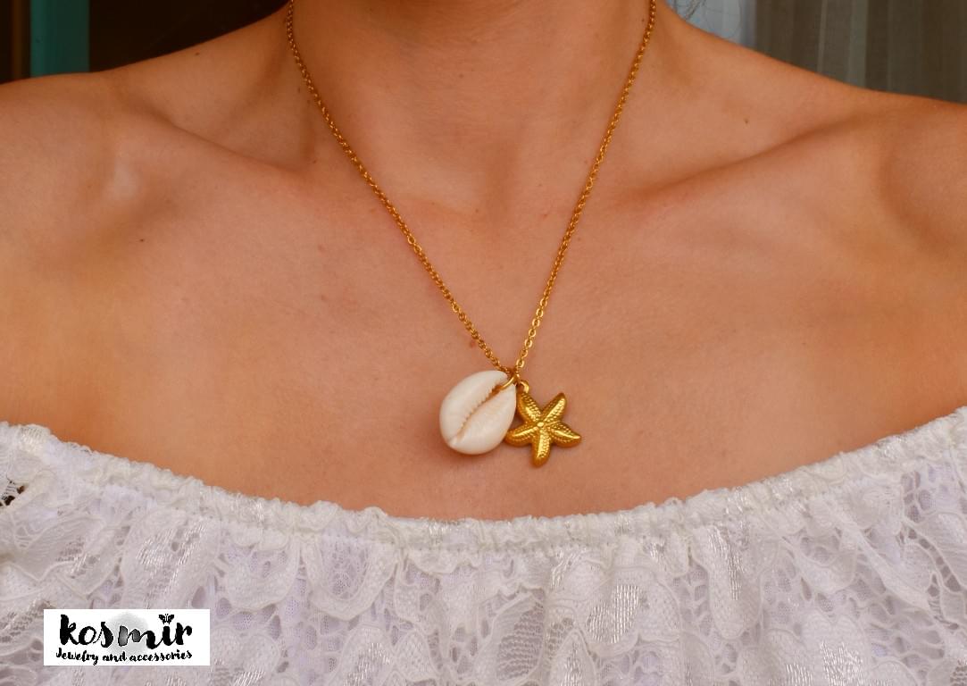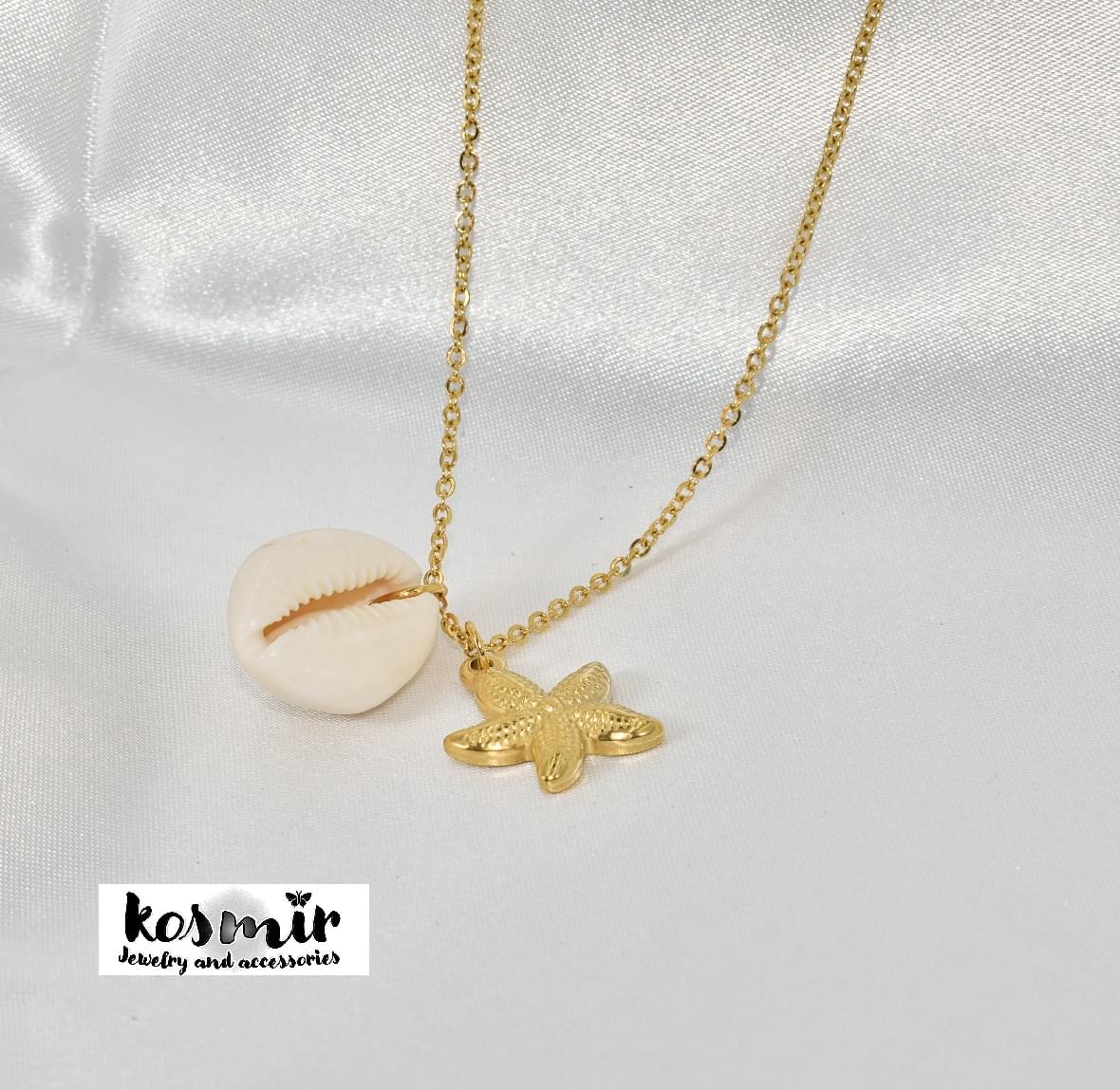 Ατσάλινο κολιέ αστερίας και κοχύλι σε χρυσό χρώμα