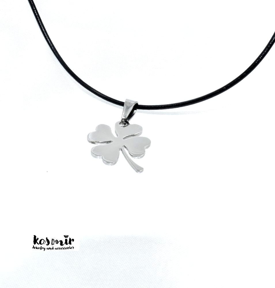 Ατσάλινο κολιέ Clover σε ασημένιο χρώμα(Δερμάτινο κορδόνι)