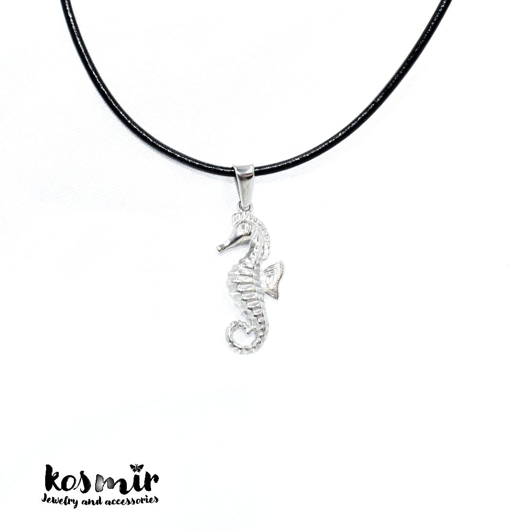 Ατσάλινο κολιέ Sea Horse σε ασημένιο χρώμα με δερμάτινο κορδόνι