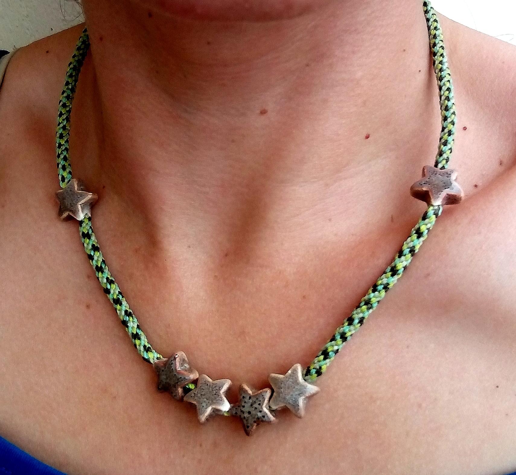 Χειροποίητο κολιέ από κερωμένη κλωστή σε πράσινες αποχρώσεις και κεραμικούς αστερίες. Ανθεκτικό στο νερό κα τη θάλασσα!