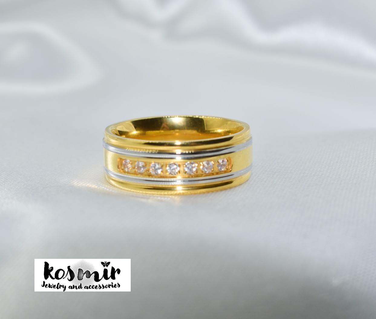 Ατσάλινο χρυσό δαχτυλίδι με ασημένιες λεπτομέρειες και ζιργκόν. Ανθεκτικό στο νερό, τη θάλασσα και τα χημικά.
